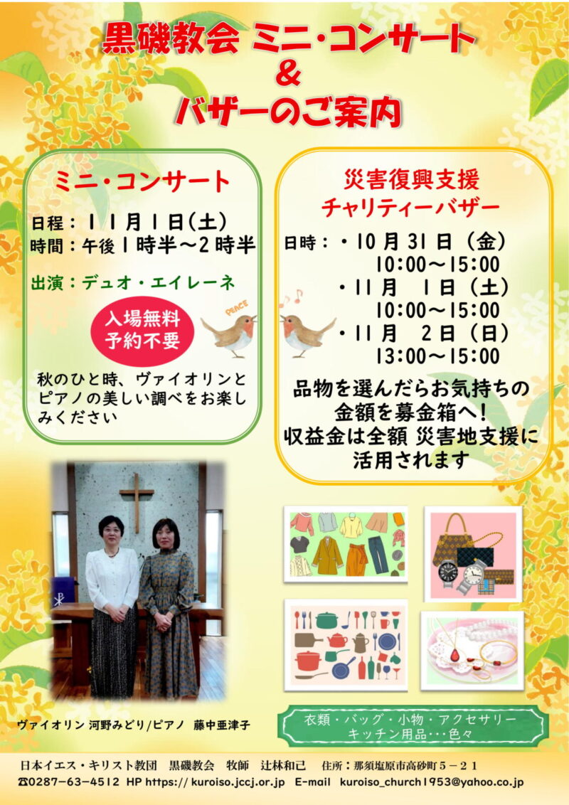 黒磯教会では、音楽と支援の心を込めたイベントを開催します。